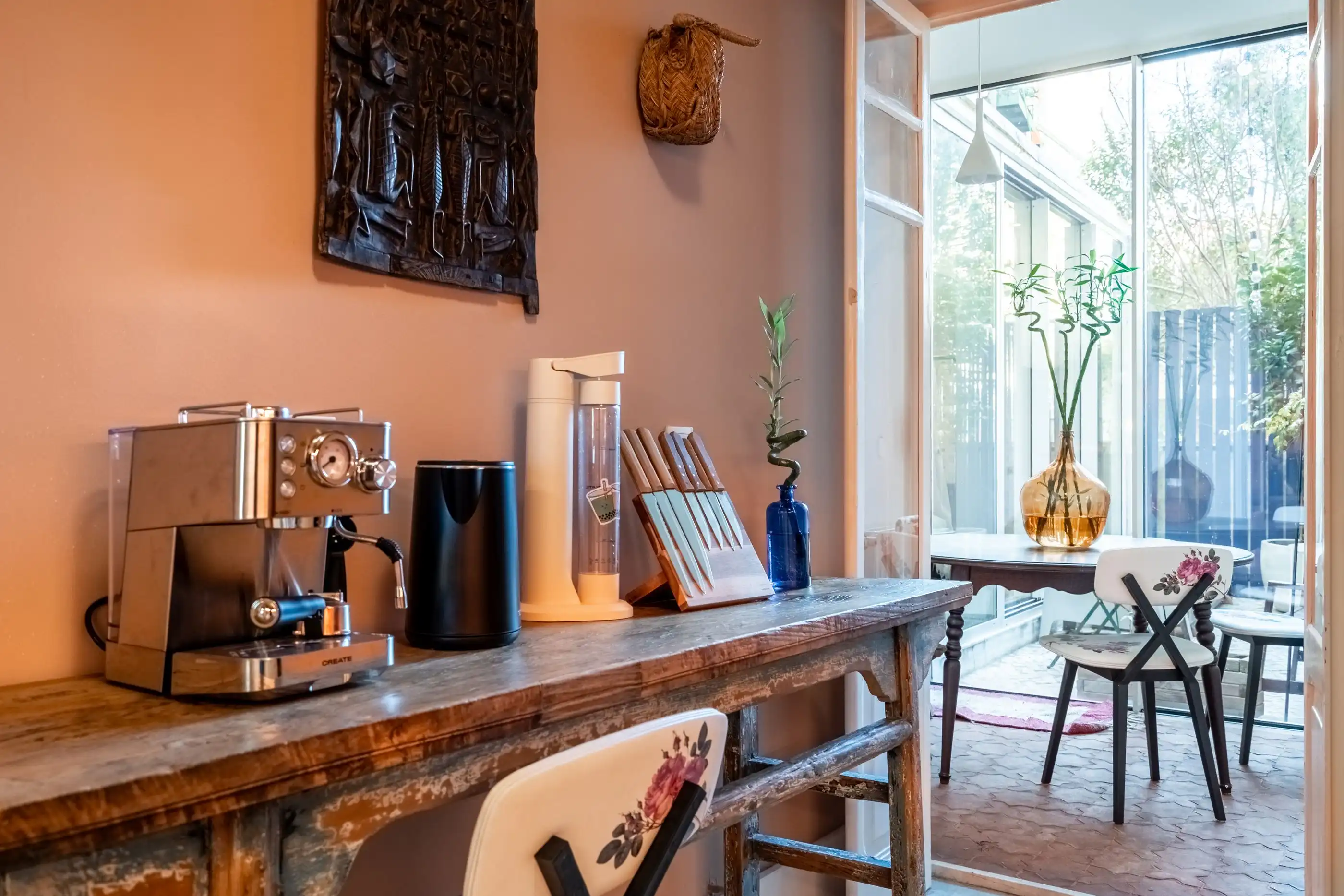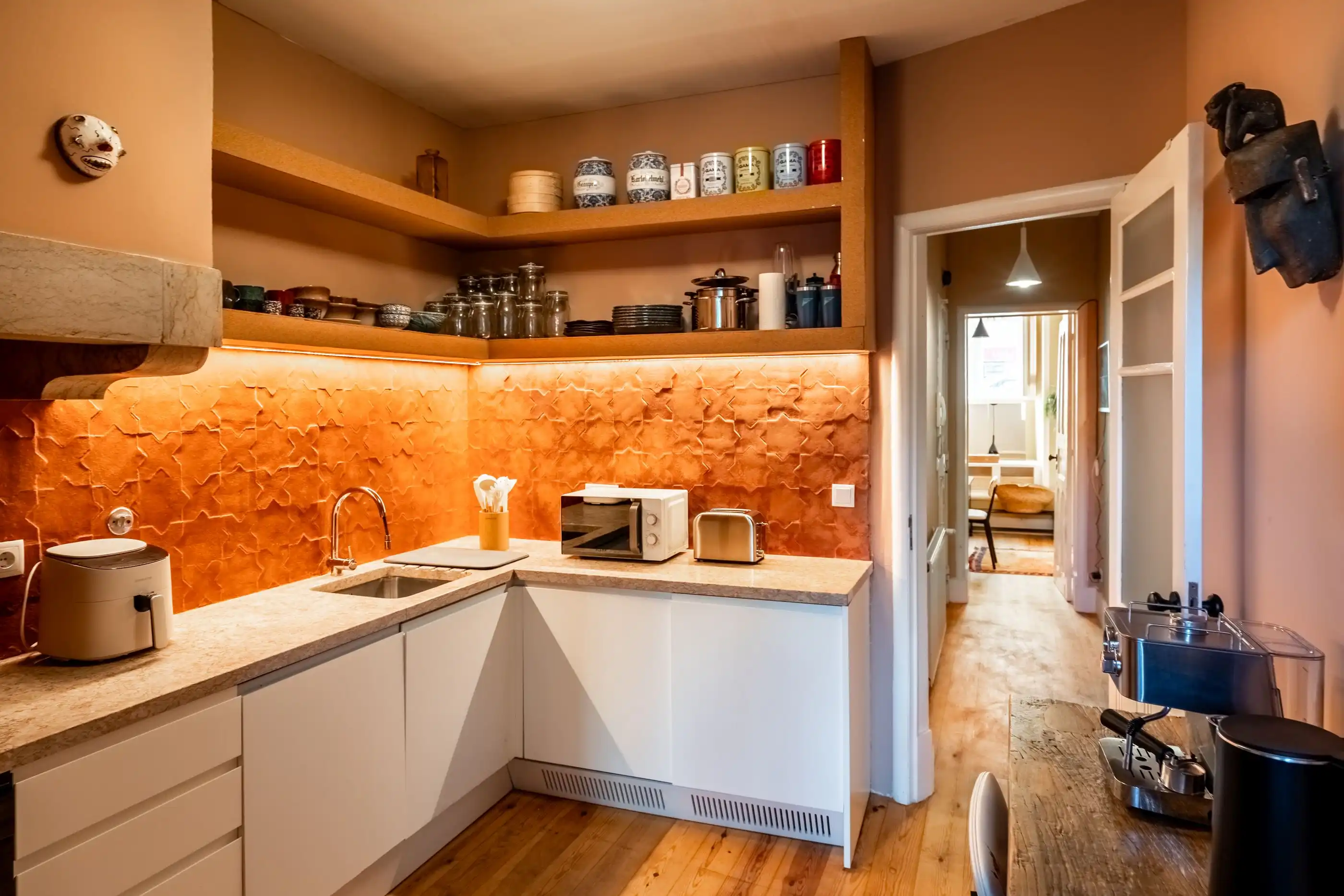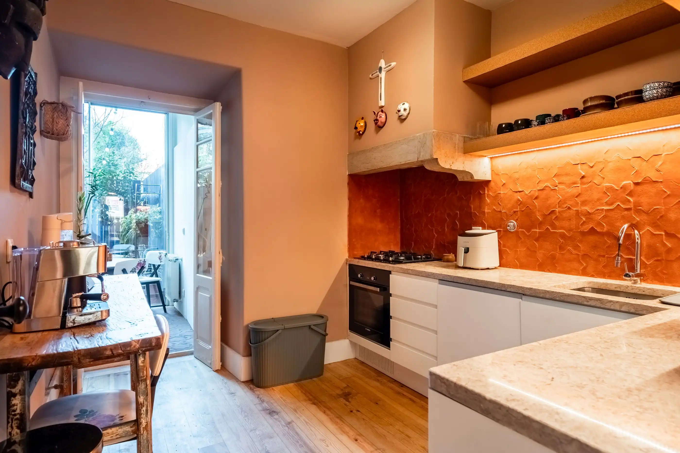 Stylish two bedroom apartment in the heart of Lisbon, right on Avenida João XXI next to Campo Pequeno. Not your typical city rental — every room has its own character: Moroccan lanterns, African wood carvings, Portuguese tiles, kilim rugs, all collected over time and put together with a genuine eye for detail. The main bedroom is warm and sunny, with a vintage wooden bed and a cosy reading nook. The second bedroom is covered floor-to-ceiling in classic Portuguese azulejos and opens directly onto the patio. That patio is the highlight: cobblestones, a lemon tree, tall cacti, and Moroccan hanging lamps — surprisingly peaceful for such a central address. The kitchen is fully equipped and full of character. The living room has retro leather sofas and more art on the walls than most galleries. Trees all around, Campo Pequeno on the doorstep, and a place that actually feels like home.
