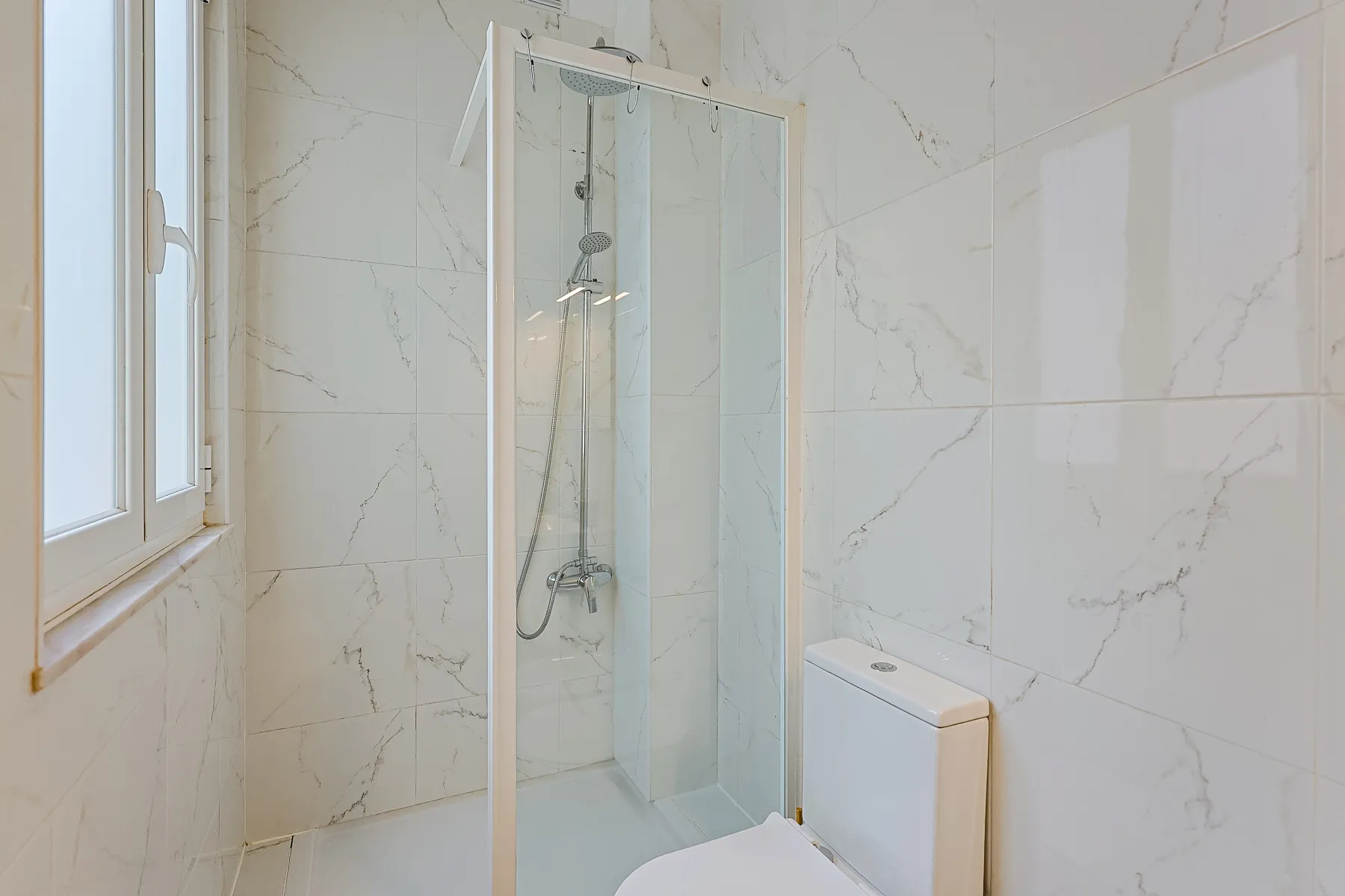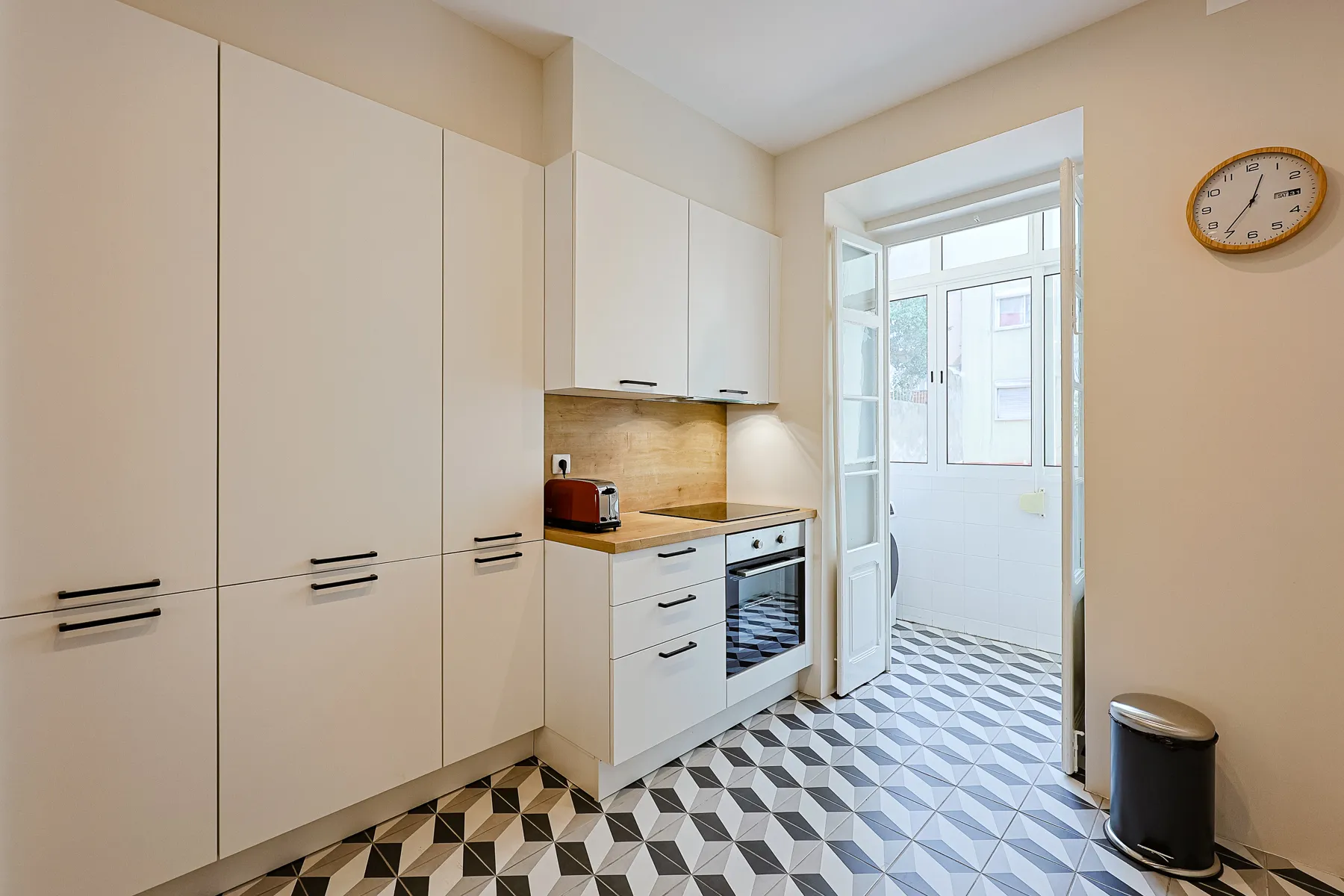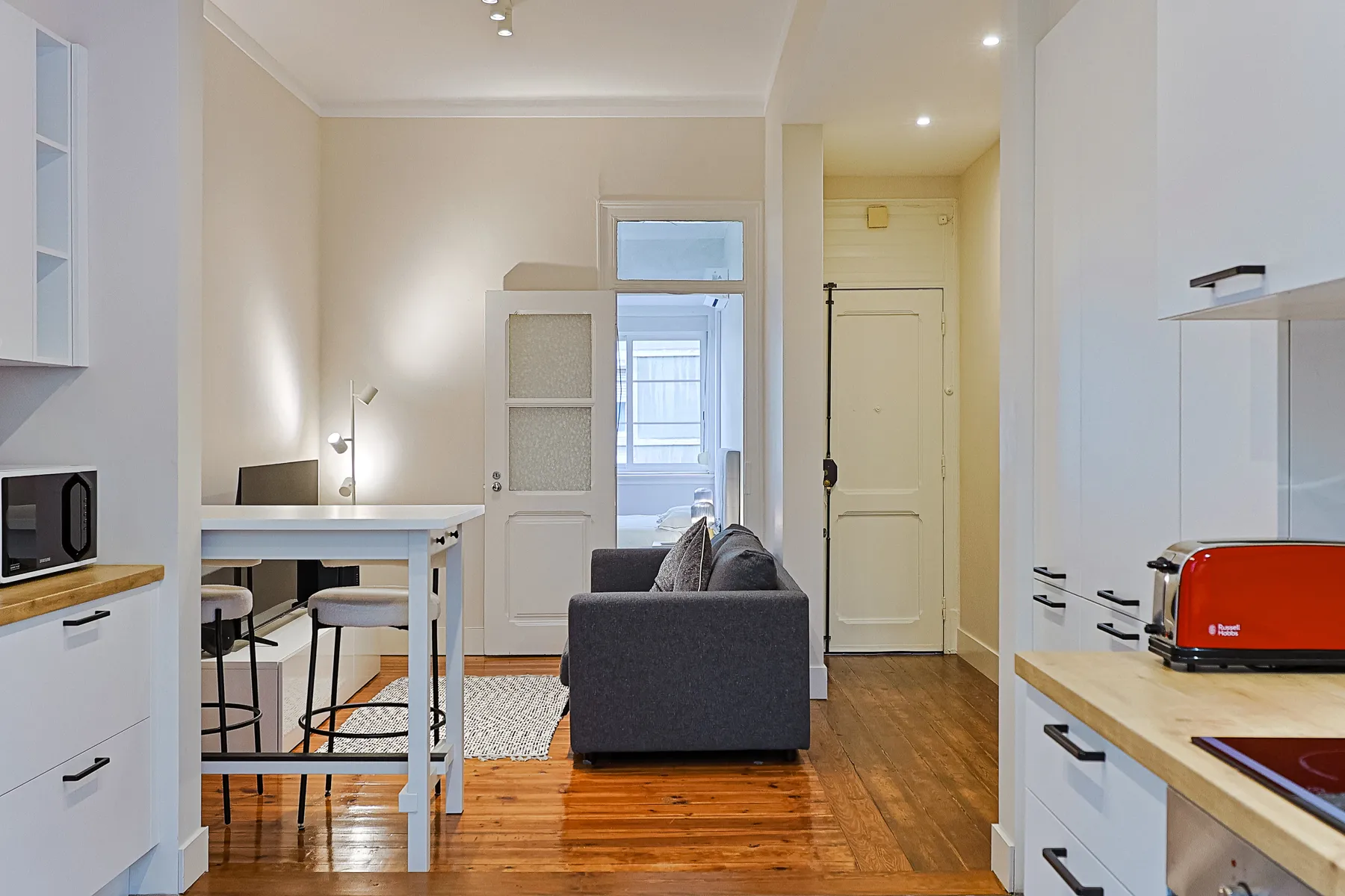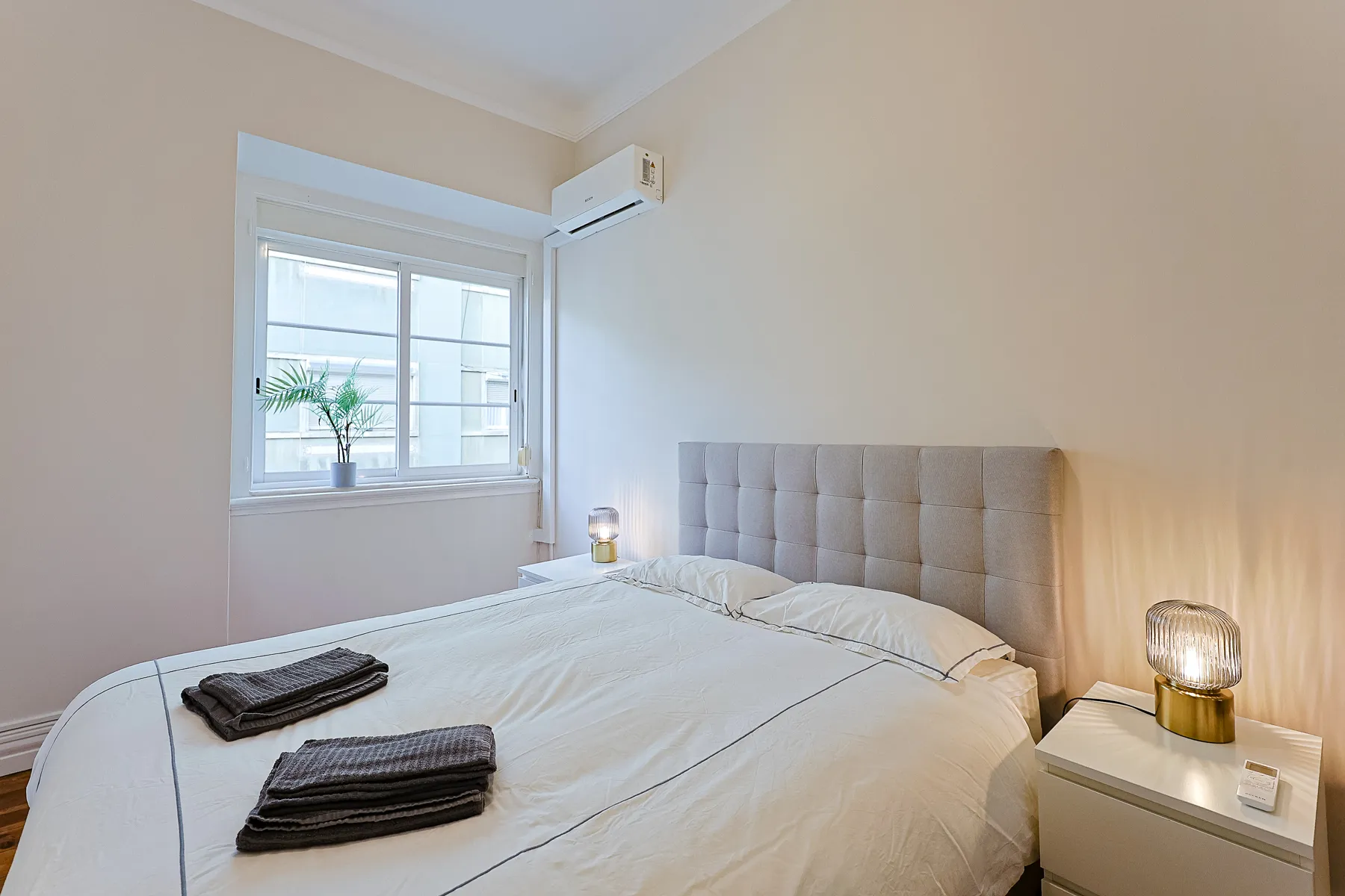 This modern and bright one-bedroom apartment offers a comfortable and refined living experience in a calm yet central Lisbon location. Thoughtfully designed, it features a spacious double bedroom with air conditioning, a light-filled living area that flows seamlessly into the kitchen, and a clean, contemporary layout ideal for everyday living. The fully equipped galley kitchen includes essential appliances and generous storage, while the elegant bathroom is finished with marble-effect tiles, a modern vanity, bidet, and a walk-in glass shower. Move-in ready and carefully furnished, this apartment is perfectly suited for professionals or couples seeking comfort, functionality, and a stylish home for mid- to long-term stays in Lisbon.