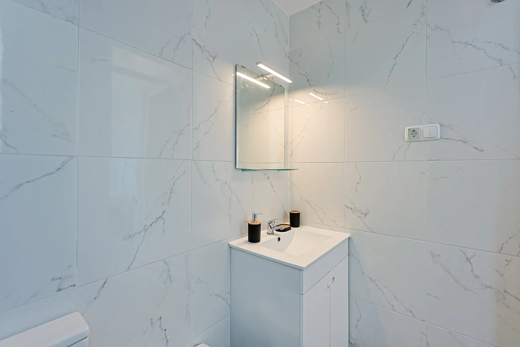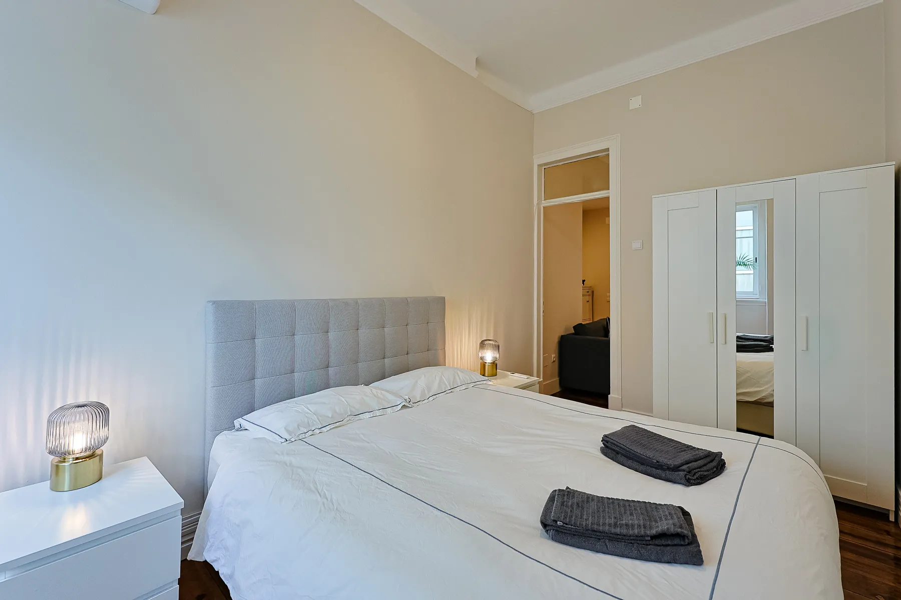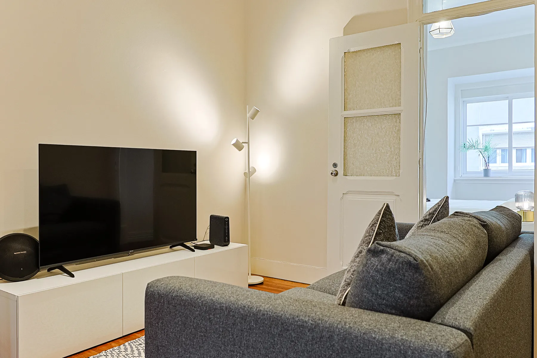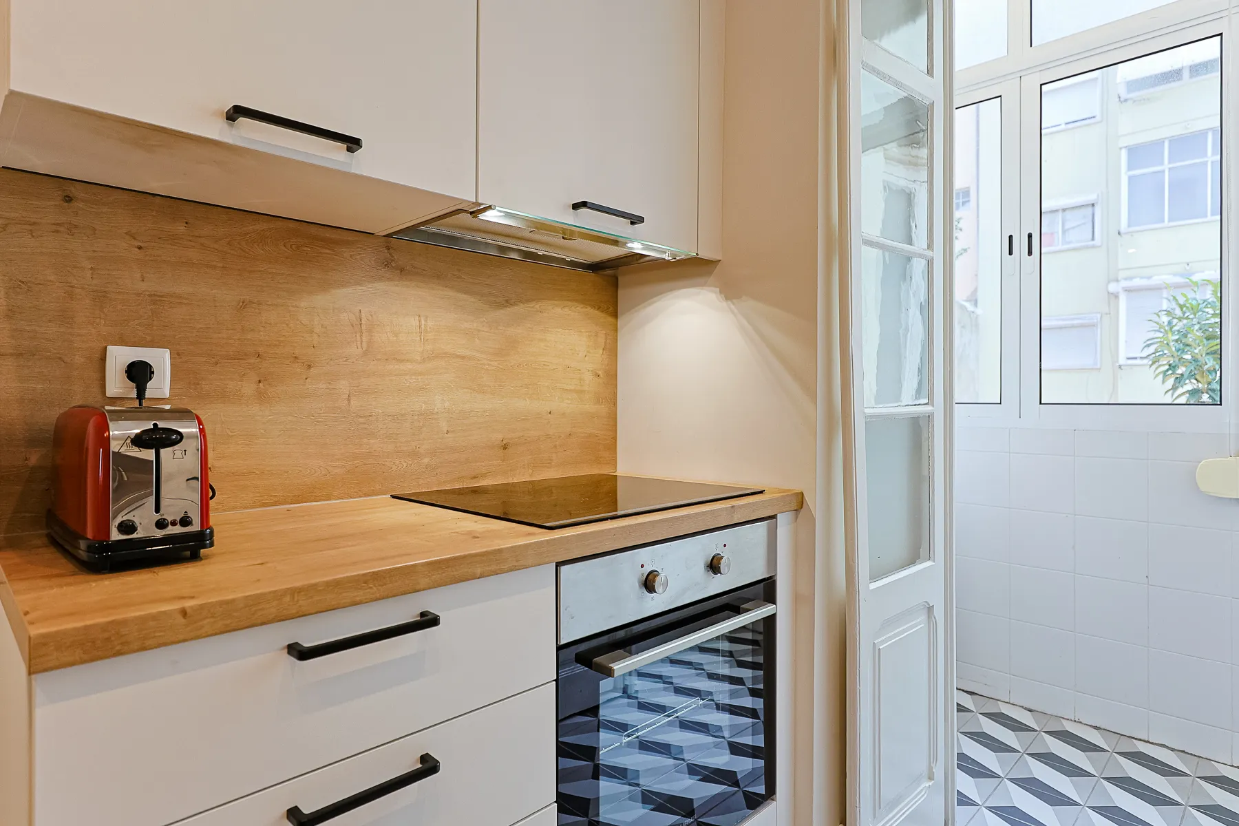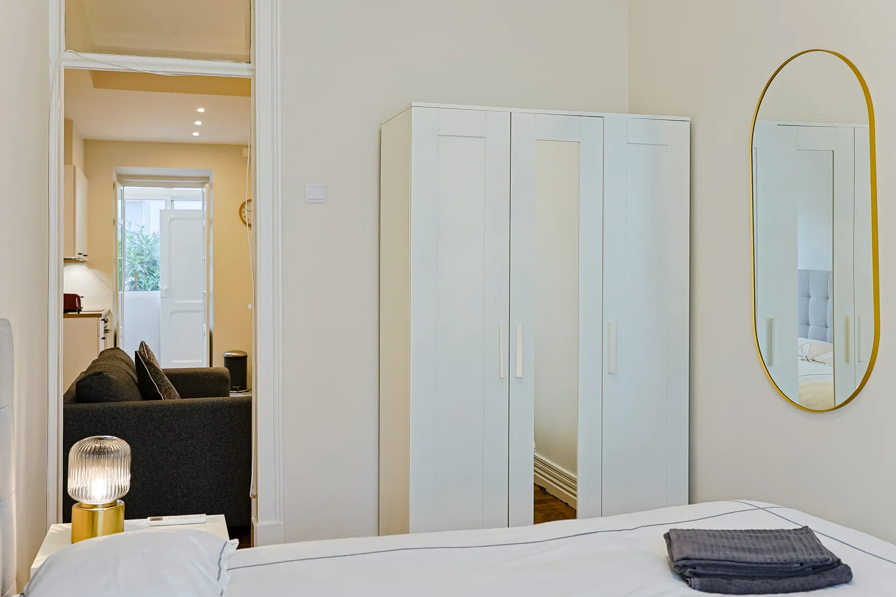This modern and bright one-bedroom apartment offers a comfortable and refined living experience in a calm yet central Lisbon location. Thoughtfully designed, it features a spacious double bedroom with air conditioning, a light-filled living area that flows seamlessly into the kitchen, and a clean, contemporary layout ideal for everyday living. The fully equipped galley kitchen includes essential appliances and generous storage, while the elegant bathroom is finished with marble-effect tiles, a modern vanity, bidet, and a walk-in glass shower. Move-in ready and carefully furnished, this apartment is perfectly suited for professionals or couples seeking comfort, functionality, and a stylish home for mid- to long-term stays in Lisbon.